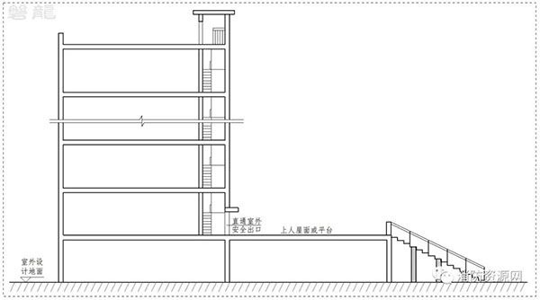 1.3 上人屋面或平台通过满足疏散要求的阶梯等直达地面,阶梯不受建筑外墙的燃烧性能和耐火极限以及建筑门窗洞口影响。(图示5)